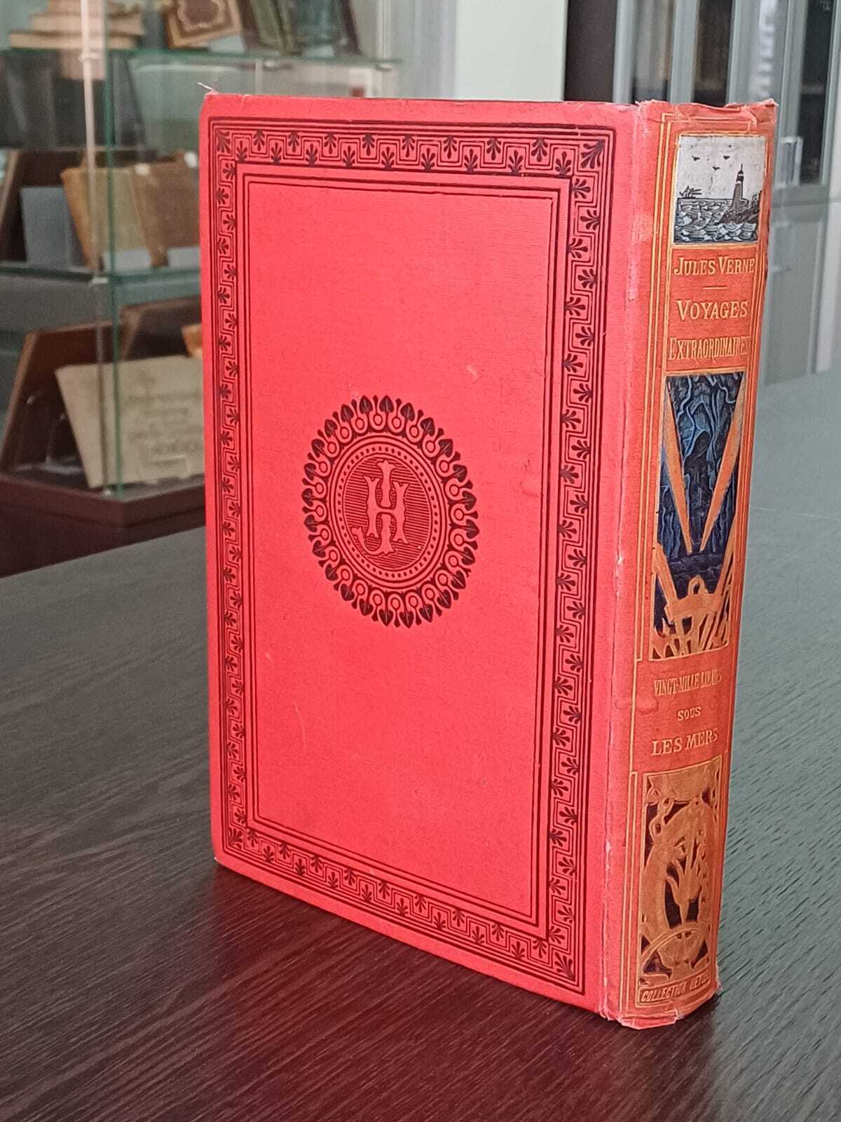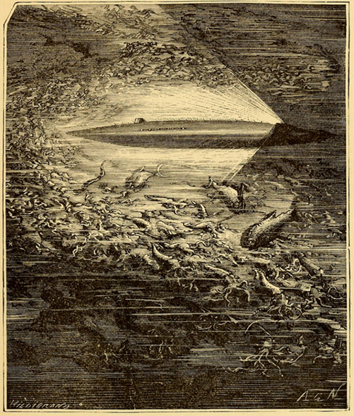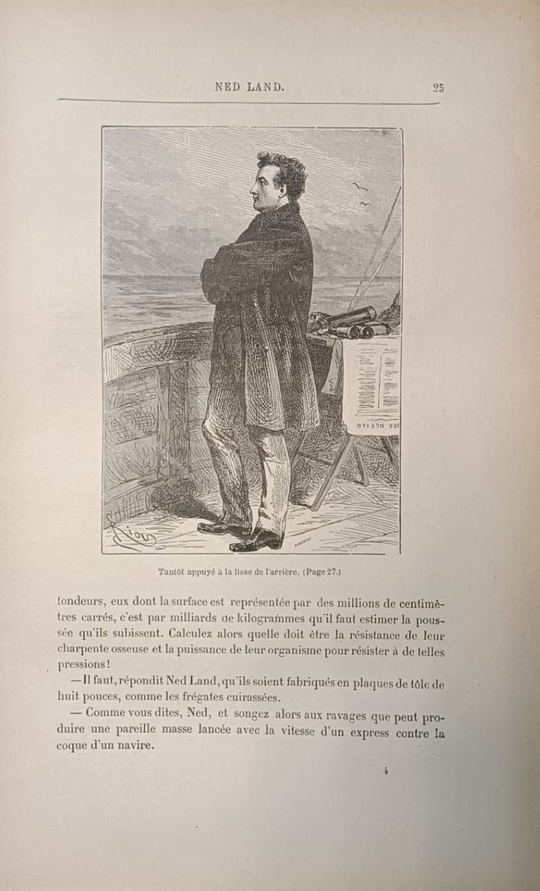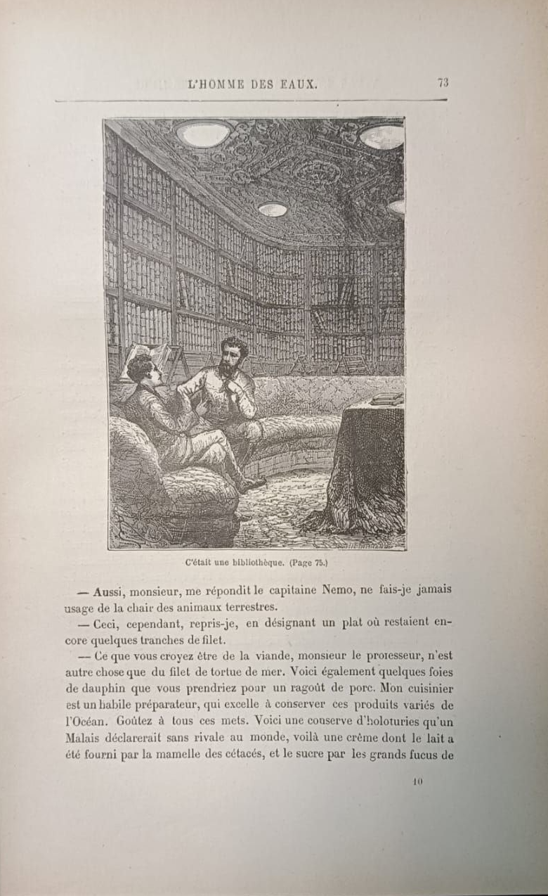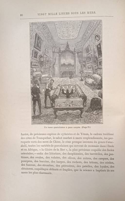 «Среди книг я увидел лучшие произведения древних и современных писателей, поэтов и мыслителей, начиная с Гомера и заканчивая Виктором Гюго, от Ксенофонта до Прудона, от Рабле до госпожи Санд. Особенно много было научных книг. Тома по механике, баллистике, гидрографии, метеорологии, географии, геологии чередовались с трудами по естественной истории. Очевидно, капитан Немо охотнее всего читал подобные произведения. Я нашёл здесь полное собрание работ Гумбольдта, Араго, Фуко, Анри Сент-Клер Девиля, Шасля, Мильна-Эдвардса, Катрфажа, Тиндаля, Фарадея, Бертло, Секки, Петермана, капитана Мори, Агассиса, а также «Записки» Академии наук, сборники различных географических обществ».
